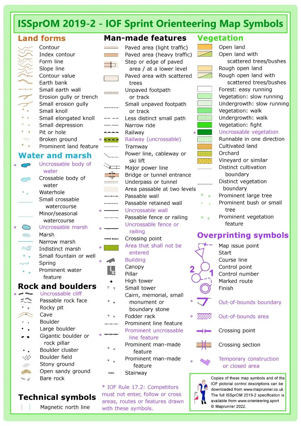 地图符号可帮助您直观地了解地图所代表的内容。大多数定向运动地图都会有一个图例,有助于定义地图上使用的符号。然而,它可能并不总是存在。定向运动地图符号的最佳资源之一是由英国的 MapRunner制作的。定向运动地图符号主要有两套。用于常规地图(ISOM 标准)的那些和用于大比例冲刺地图(ISSOM 标准)的那些。