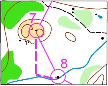 让我们看一个简单的例子。您位于 7 号控制点,正在计划前往 8 号控制点。8 号控制点位于一条小溪附近的一块巨石上,这是一条长线状地物。附近没有其他功能可以帮助您参考。